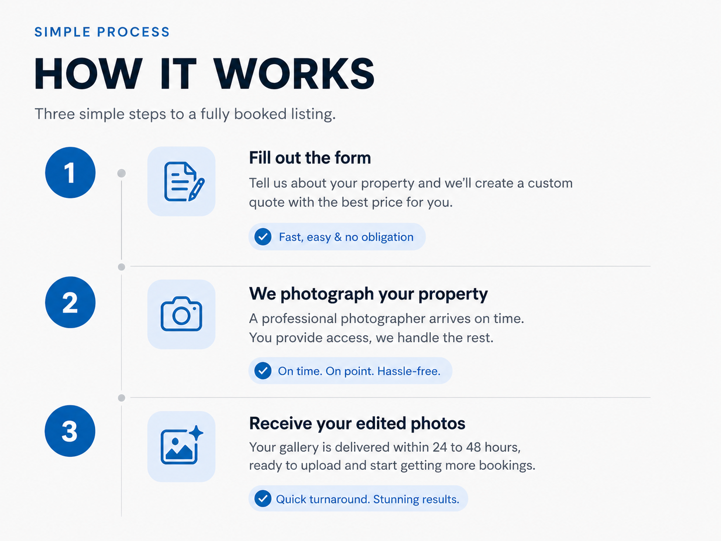 Click "Book Now" to get started. After submitting you'll receive a call from our team to discuss your property, confirm the shoot details and match you with the right photographer for your space.